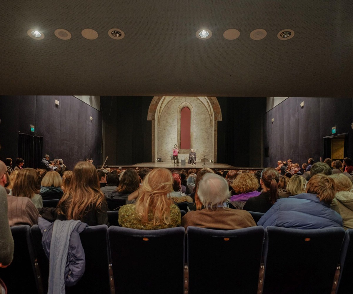 Lo spazio teatrale sarà quindi attraversato in tutti i suoi anfratti e “bolge”: la platea liberata dalle sedie, la galleria, le scale, gli uffici, i gabinetti, l’abside romanica in fondo al palco: da lì, scendendo nel sottopalco da una porticina, si potrà finalmente uscire nel giardino che sta dietro la chiesa-teatro, “a riveder le stelle”.