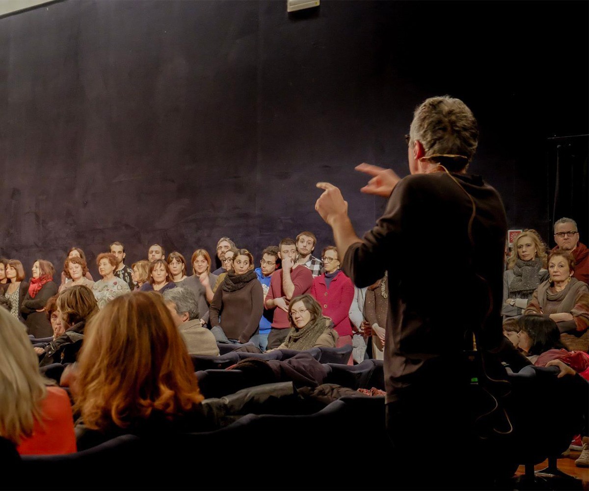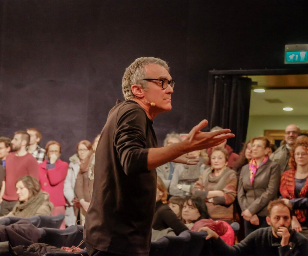 Partiamo da qui perché concordiamo con l’erudito veneziano, e ne raccogliamo l’implicita sfida: trasformare in teatro il capolavoro che ha dato origine alla lingua e alla letteratura italiana. Già altri hanno tentato: noi pensiamo che non si tratti di rivestire di immagini sceniche i canti danteschi, quanto di estrarne l’intima “natura” teatrale. Dante si è veramente “alzato al paro di Eschilo e di Shakespeare”, e i suoi 14.233 endecasillabi ripartiti in terzine sono uno stupefacente congegno teatrale. La parola “teatron”, che significa “visione”, racchiude proprio quella che l’autore definisce “mirabile visione”, mirabile teatro quindi, capace di accogliere nel suo campo visivo l’umanità intera nelle sue molteplici esperienze, dal basso osceno e sanguinante dell’Inferno al trascolorare malinconico del Purgatorio, per ascendere infine là dove visione e parola si trasmutano nell’indicibile Paradiso.